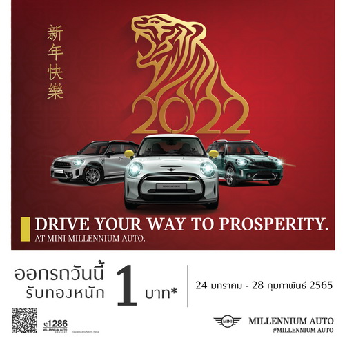 บริษัท มิลเลนเนียม ออโต้ กรุ๊ป จำกัด ผู้แทนจำหน่ายรถยนต์ บีเอ็มดับเบิลยูและ มินิจัดกิจกรรม ‘DRIVE YOUR WAY TO PROSPERITY’ ต้อนรับตรุษจีนปีเสือทอง สัมผัสยนตรกรรมบีเอ็มดับเบิลยู และ มินิ หลากรุ่น ที่มาพร้อมราคาพิเศษ วันนี้ ถึง 28 กุมภาพันธ์ 2565 ที่โชว์รูมบีเอ็มดับเบิลยู มิลเลนเนียม ออโต้ และ มินิ มิลเลนเนียม ออโต้ ทุกสาขา หรือโทร. 1286 Millennium Auto Connect