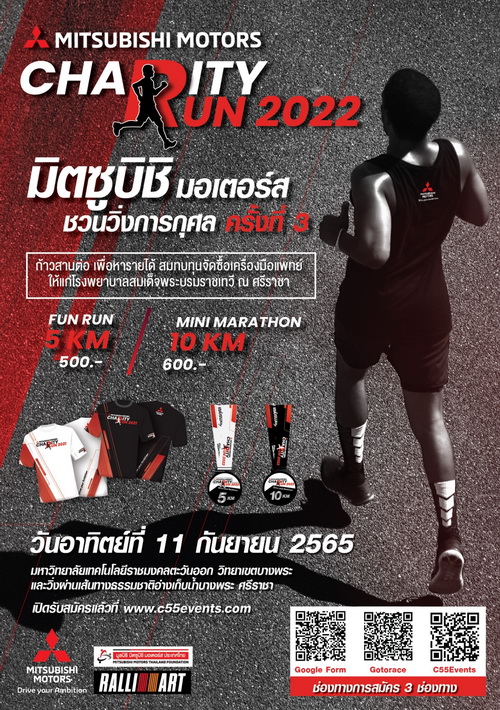 บริษัท มิตซูบิชิ มอเตอร์ส (ประเทศไทย) จำกัด ผู้จัดกิจกรรม ซึ่งร่วมสนับสนุนโดย มูลนิธิ มิตซูบิชิ มอเตอร์ส ประเทศไทย ขอเชิญชวนนักวิ่งทุกท่านร่วมวิ่งการกุศล ครั้งที่ 3 หรือ “Mitsubishi Motors Charity Run 2022” ในวันอาทิตย์ที่ 11 กันยายน 2565 บนเส้นทางอ่างเก็บน้ำบางพระ อำเภอศรีราชา จังหวัดชลบุรี โดยรายได้ส่วนหนึ่งจากงานวิ่งการกุศลจะนำไปสมทบทุนจัดซื้อเครื่องมือทางการแพทย์ให้แก่โรงพยาบาลสมเด็จพระบรมราชเทวี ณ ศรีราชา