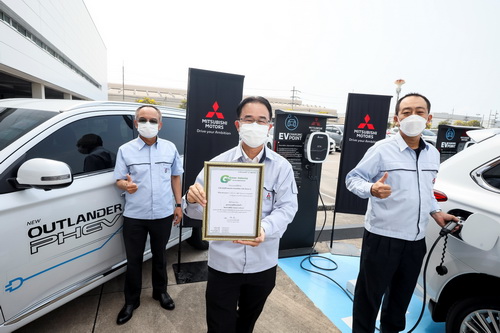 นายเอกอธิ รัตนอารี (ซ้าย) กรรมการรองผู้จัดการใหญ่ สายงานทรัพยากรบุคคลและบริหารทั่วไป, นายกิตติ ลีลาวัฒนานันท์ (ตรงกลาง) ผู้ช่วยกรรมการผู้จัดการใหญ่อาวุโส สายงานผลิตถือใบรับรองอุตสาหกรรมสีเขียวระดับที่ 4 และ มร. มิกิฮิสะ คาโนะ (ขวา) ผู้ช่วยกรรมการผู้จัดการใหญ่อาวุโส สายงานวิศวกรรมการผลิต ร่วมถ่ายภาพกับรถยนต์มิตซูบิชิ เอาท์แลนเดอร์ พีเอชอีวี รถยนต์ไฟฟ้าปลั๊กอินไฮบริดสัญชาติญี่ปุ่นรุ่นแรกที่ผลิตใน ประเทศไทยเมื่อปี พ.ศ.2563 ที่ผ่านมา