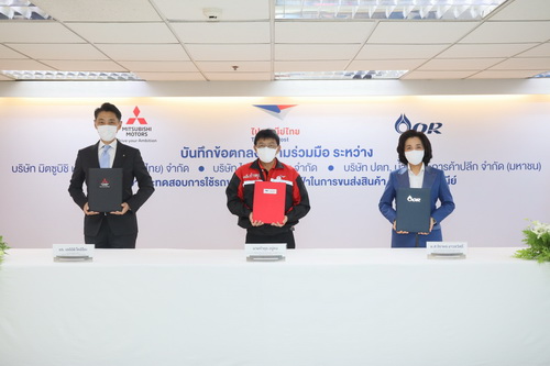 มร. เออิอิชิ โคอิโตะ กรรมการผู้จัดการใหญ่ บริษัท มิตซูบิชิ มอเตอร์ส (ประเทศไทย) จำกัด พร้อมด้วยนายกำพุธ อยู่คง ประธานเจ้าหน้าที่บริหาร สายงานระบบไปรษณีย์และปฏิบัติการนครหลวง บริษัท ไปรษณีย์ไทย จำกัด (ปณท) และ นางสาวจิราพร vขาวสวัสดิ์ ประธานเจ้าหน้าที่บริหารและกรรมการผู้จัดการใหญ่ บริษัท ปตท. น้ำมัน และการค้าปลีก จำกัด (มหาชน) (โออาร์)