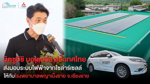 มิตซูบิชิ มอเตอร์ส ประเทศไทย ได้ทำการส่งมอบระบบไฟฟ้าจากโซล่าร์เซลล์ ซึ่งเป็นส่วนหนึ่งของโครงการ ‘Solar For Lives : พลังงานแสงอาทิตย์ เพื่อชีวิตที่ดีกว่า’ ให้กับโรงพยาบาลพญาเม็งราย จังหวัดเชียงราย ซึ่งนับเป็นโรงพยาบาลชุมชนแห่งที่ 2 ของโครงการฯ