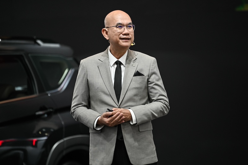 ผู้บริหารมิตซูบิชิยืนกล่าวบนเวทีในงาน Motor Expo 2025 พร้อมพื้นหลังรถยนต์รุ่นใหม่