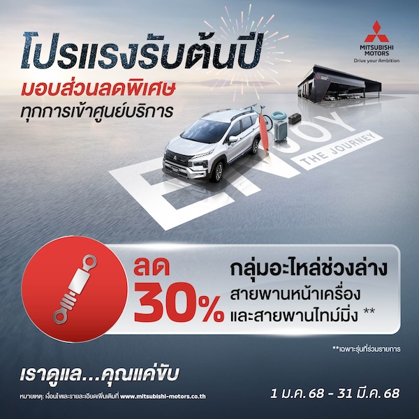 บริษัท มิตซูบิชิ มอเตอร์ส (ประเทศไทย) จำกัด เปิดตัวแคมเปญบริการหลังการขายสุดพิเศษสำหรับเจ้าของรถมิตซูบิชิ ที่หมดระยะเวลาการรับประกัน ด้วยการมอบส่วนลดร้อยละ 30 สำหรับกลุ่มอะไหล่ช่วงล่าง สายพานหน้าเครื่อง และสายพานไทม์มิ่งที่ร่วมรายการ