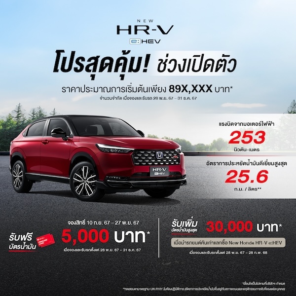 บริษัท ฮอนด้า ออโตโมบิล (ประเทศไทย) จำกัด ขอบคุณความเชื่อมั่นจากลูกค้าที่มีต่อ ฮอนด้า เอชอาร์-วี อี:เอชอีวี ใหม่ รุ่นไมเนอร์เชนจ์ ด้วยยอดจองสิทธิ์กว่า 3,000 คัน ตั้งแต่ 10 กันยายน 2567 – 21 ตุลาคม 2567 ตอกย้ำความเป็นรถ SUV ฟูลไฮบริดยอดนิยมจากฮอนด้าในใจลูกค้าชาวไทย ทั้งนี้ ฮอนด้า มุ่งหวังที่จะขยายฐานลูกค้าไปหลากหลายกลุ่มให้มากขึ้น