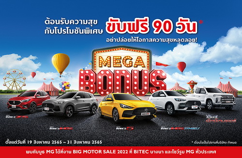 สู่สาธารณชนอย่างเป็นทางการ พร้อมจัดแคมเปญ MG MEGA BONUS ให้ลูกค้าขับรถฟรี 90 วัน ในงาน Big Motor Sale 2022 ณ บูธเอ็มจี หมายเลข A02 ฮอลล์ EH101 ศูนย์นิทรรศการและการประชุมไบเทค บางนา ระหว่างวันที่ 19-28 สิงหาคม นี้