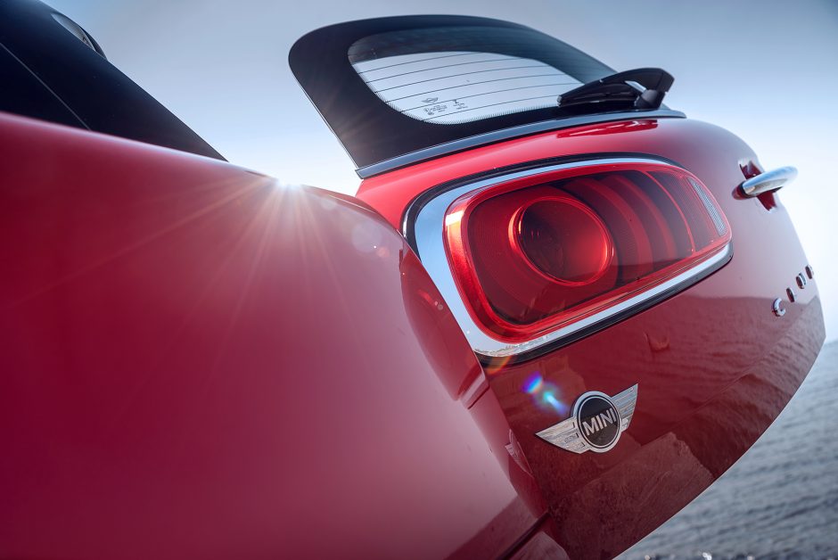 งานออกแบบไฟท้ายแนวนอนแบบ LED ที่คั่นกลางด้วยมือจับเปิดประตูท้ายสไตล์ “ตู้กับข้าว” พร้อมการประทับตัวอักษร Clubman อยู่ด้านล่าง โดยใต้ชุดไฟท้ายด้านซ้าย คือ โลโก้แบรนด์ Mini