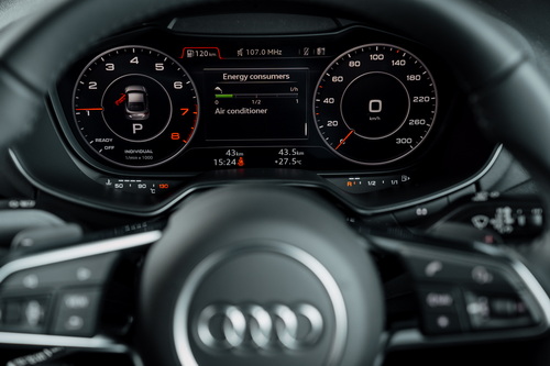 ห้องโดยสารโทนสีดำเข้มขรึม เบาะนั่งคู่หน้าแบบสปอร์ตหุ้มหนังสลับ Alcantara ระบบข้อมูลและความบันเทิงครบครัน หน้าปัดแบบ Virtual Cockpit ขนาด 12.3 นิ้ว MMI Navigation Plus เชื่อมต่อ smartphone ได้ง่ายเพียงปลายนิ้ว