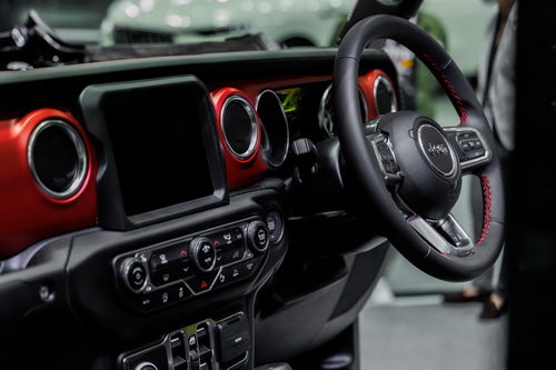ตัดกันกับตะเข็บแดง พร้อมปักโลโก้ รูบิคอน บริเวณพนักพิง ส่วนเบาะหลังสามารถพับได้ 3 แบบ รองรับการใช้งานอย่างอเนกประสงค์ ขับกล่อมผู้โดยสารด้วยเสียงดนตรีไพเราะ ผ่านลำโพง Alpine 9 ตำแหน่ง พร้อมอุ่นใจในทุกการเดินทาง ด้วยระบบนำทาง Uconnect ผสานทัชสกรีน 8.4 นิ้ว ที่รองรับระบบปฏิบัติการ Android และ iOS