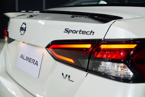 รูปโฉมภายนอก อัลเมร่า ใหม่ ได้รับการเพิ่มความสปอร์ตพรีเมียม ด้วยกันชนหน้าใหม่โฉบเฉี่ยว ตกแต่งด้วยวัสดุสีเงิน ล้ออัลลอย 15 นิ้ว ดีไซน์ใหม่ กันชนหลังใหม่ตกแต่งด้วยวัสดุสีเงิน หลังคาใหม่สีดำเงา กระจกมองข้างไฟฟ้าปรับพับอัตโนมัติ ตกแต่งด้วยวัสดุสีดำเงาพร้อมไฟเลี้ยวแบบ LED และสปอยเลอร์หลังทรงสปอร์ต ตกแต่งด้วยวัสดุสีดำเงา* เติมเต็มรูปลักษณ์ให้โดดเด่นมีเอกลักษณ์มากยิ่งขึ้น
