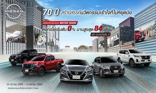 นอกจากนี้ นิสสัน ยังได้เฉลิมฉลองเนื่องในโอกาสของการดำเนินธุรกิจในประเทศไทย ครบรอบ 70 ปี ด้วยการมอบข้อเสนอพิเศษและโปรโมชันต่าง ๆ ตั้งแต่วันที่ 1 มีนาคม จนถึงวันที่ 30 เมษยน พ.ศ. 2565 ที่ช่วยให้ทุกคนเป็นเจ้าของรถยนต์นิสสันได้ง่ายขึ้นและคุ้มค่ามากยิ่งขึ้น อาทิ*