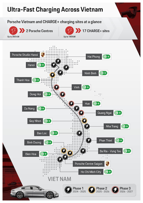 โครงการนี้จะดำเนินการติดตั้งสถานีชาร์จ 17 แห่ง ทั่วประเทศภายในระยะเวลา 3 ปี รวมถึงการผนวกสถานีชาร์จประสิทธิภาพสูง 2 แห่ง ที่มีอยู่เดิม ณ ปอร์เช่ สตูดิโอ ฮานอย (Porsche Studio Hanoi) และ ศูนย์ปอร์เช่ ไซ่ง่อน (Porsche Centre Saigon) ไว้บนแอปพลิเคชันของ Charge+ อีกด้วย