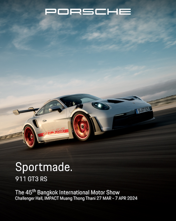 ปอร์เช่ ประเทศไทย โดย เอเอเอส กรุ๊ป ผู้นำเข้าและตัวแทนจำหน่ายรถยนต์ปอร์เช่อย่างเป็นทางการแต่เพียงผู้เดียวในประเทศไทย ขอเรียนเชิญทุกท่านเข้าร่วมงาน “บางกอก อินเตอร์เนชั่นแนล มอเตอร์โชว์ 2024 ครั้งที่ 45” ภายในงานจะมีการปรากฏตัวของ 911 GT3 RS รถสปอร์ตสมรรถนะสูงที่ถ่ายทอด DNAของรถแข่งปอร์เช่ไว้อย่างแท้จริง