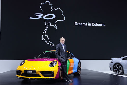 ภายในงาน บางกอก อินเตอร์เนชั่นแนล มอเตอร์โชว์ ครั้งที่ 44th ประจำปี 2023 ปอร์เช่ ประเทศไทย จัดแสดงรถสปอร์ตรุ่นพิเศษ เปรียบเสมือนตัวแทนการมาถึงของปอร์เช่ 911 Carrera GTS – 30 Years Porsche Thailand Edition หนึ่งเดียวของรถที่จัดแสดงในงานที่ได้รับการตกแต่งด้วยสีบนตัวถังทั้งเจ็ดเฉดสี ซึ่งเป็นการทำสีด้วยมือของช่างสีผู้เชี่ยวชาญจาก Porsche Exclusive Manufaktur โดยใช้ระยะเวลากว่าหนึ่งเดือน