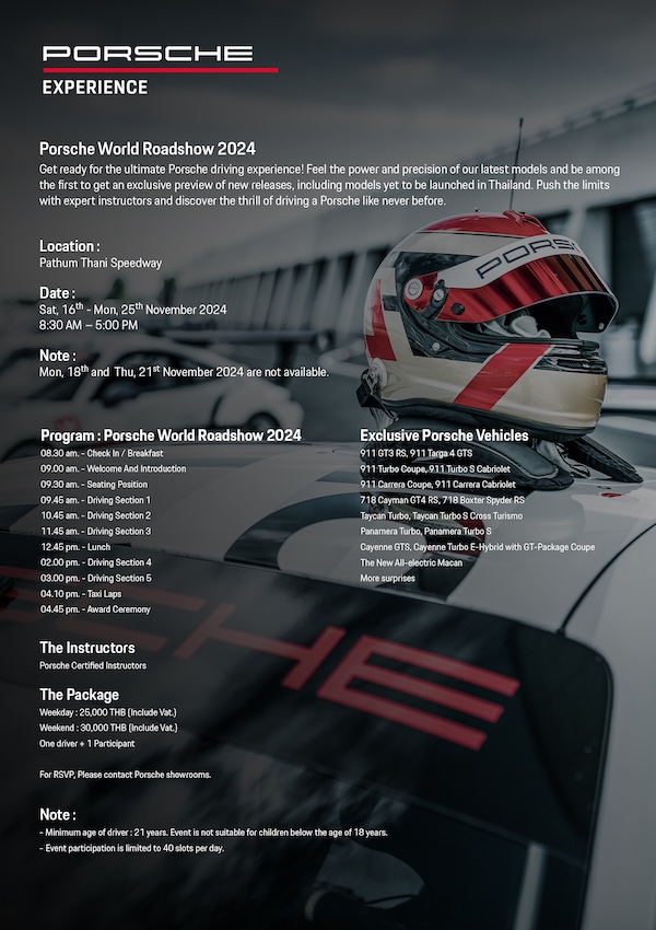ปอร์เช่ประเทศไทย โดย เอเอเอส กรุ๊ป เชิญชวนแฟนพันธุ์แท้ปอร์เช่เตรียมพบกับความเร็ว ความแรง ดุดัน ระดับเวิลล์ คลาส ในงาน “Porsche World Roadshow 2024” กิจกรรม Driving Experience ที่จะพาคุณไปสัมผัสกับบรรยากาศการทดสอบสมรรถนะการขับขี่