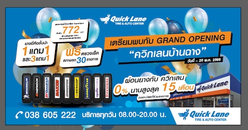 ควิกเลน ยังจัดเต็มมอบโปรโมชั่นพิเศษสุดเร้าใจฉลองเปิดสาขาใหม่ ด้วยโปรโมชั่นยางรถยนต์ยี่ห้อชั้นนำคุณภาพมาตรฐานระดับสากล ได้แก่ โปรโมชั่นซื้อยาง 1 เส้น แถมฟรี 1 เส้น และซื้อยาง 3 เส้น แถมฟรี 1 เส้น ตั้งแต่วันนี้ถึง 20 พ.ค. 2566 เฉพาะลูกค้าสาขาบ้านฉางเท่านั้น