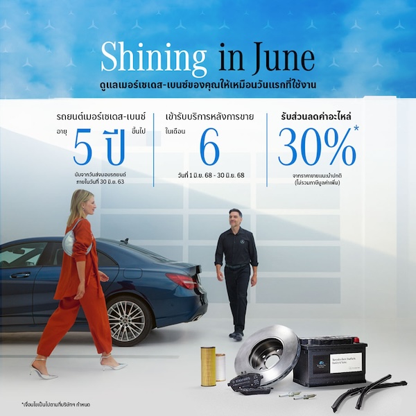 เมอร์เซเดส-เบนซ์ (ประเทศไทย) ให้ความสำคัญในการดูแลลูกค้าที่ใช้รถยนต์มากกว่า 5 ปี ให้คงสภาพการใช้งานให้เหมือนวันแรกที่ใช้งาน เพื่อตอบแทนความไว้วางใจของลูกค้าที่เข้ารับบริการอย่างต่อเนื่อง ด้วยแคมเปญ “Shining in June”