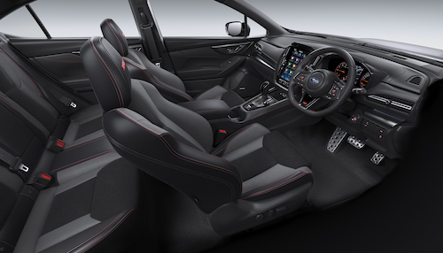 สมรรถนะของรถถ่ายทอดออกมาได้อย่างมีประสิทธิภาพผ่านการตกแต่งภายในด้วยหนังกลับทูโทนสีเทาและสีดำ พร้อมด้วยการเดินด้ายสีแดงและเน้นลวดลายคาร์บอนไฟเบอร์ทั่วทั้งคัน ทันทีที่ผู้ขับขี่ก้าวเข้าไปในห้องโดยสารของ WRX ปี 2023 จะพบกับกับพวงมาลัยหุ้มหนังฝัง โลโก้ STI อยู่บนพวงมาลัยและจอแสดงผลสำหรับคนขับ