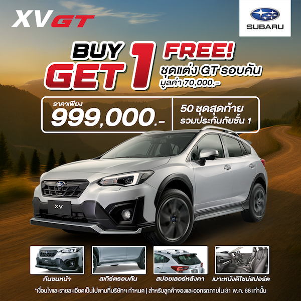 - ออก SUBARU XV EyeSight ด้วยแคมเปญ BUY 1 GET 1 FREE ในราคาเพียง 999,000 บาท รวมฟรีประกันภัยชั้นหนึ่ง และพิเศษชุดแต่ง GT สุดสปอร์ต