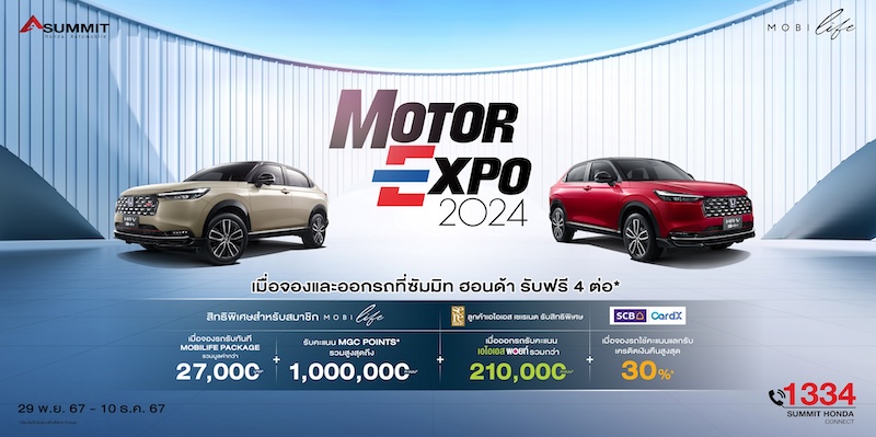 ที่บูธรถยนต์ ฮอนด้า ภายในงาน มหกรรมยานยนต์ ครั้งที่ 41 ณ ชาเลนเจอร์ ฮอลล์ 1-3 ศูนย์แสดงสินค้าและการประชุม อิมแพ็ค เมืองทองธานี หรือรับข้อเสนอสุดพิเศษ ได้ที่โชว์รูม ซัมมิท ฮอนด้า ทั้ง 5 สาขา คือ หัวหมาก, พัฒนาการ, อุดมสุข, บางนา กม. 4.5 และ หาดใหญ่