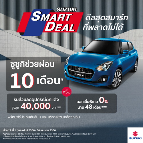 และเพื่อเป็นการแสดงความขอบคุณ รวมทั้งช่วยกระตุ้นกำลังซื้อของกลุ่มลูกค้าที่สนใจให้สามารถเป็นเจ้าของรถยนต์สปอร์ตแฮทช์แบ็กรุ่นนี้ได้ง่ายมากยิ่งขึ้น ซูซูกิ จึงได้จัดแคมเปญพิเศษ “SUZUKI SMART DEAL ดีลสุดสมาร์ทที่พลาดไม่ได้” สำหรับลูกค้าที่จองและรับรถยนต์ SUZUKI SWIFT ทุกรุ่น ภายในวัน ที่ 1 กุมภาพันธ์ – 30 เมษายน 2566