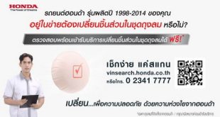 บริษัท ฮอนด้า ออโตโมบิล (ประเทศไทย) จำกัด ตอกย้ำความปลอดภัยในการขับขี่บนท้องถนน แจ้งลูกค้าผู้ใช้รถยนต์ฮอนด้ารุ่นผลิตปี ค.ศ. 1998 – 2014 (พ.ศ. 2541 – 2557) ให้เข้ารับการตรวจสอบรถยนต์ว่าเข้าข่ายต้องเปลี่ยนชิ้นส่วนในชุดถุงลมหรือไม่ โดยสามารถเช็กด้วยตนเองเพียงสแกน QR Code และกรอกหมายเลขตัวถังรถยนต์ หรือผ่านทางเว็บไซต์ https://vinsearch.honda.co.th ทั้งนี้ ลูกค้าที่เข้าข่ายต้องเปลี่ยนชิ้นส่วนในชุดถุงลมและยังไม่ได้เข้ารับการบริการ สามารถทำการนัดหมายล่วงหน้าและนำรถเข้ารับบริการเปลี่ยนฟรีโดยไม่มีค่าใช้จ่าย* ด้วยบริการที่รวดเร็วสามารถรอรับรถได้เลย ที่ศูนย์บริการฮอนด้าทั้ง 224 แห่งทั่วประเทศ สำหรับการเรียกรถยนต์ฮอนด้าเพื่อเข้ารับการตรวจสอบและเปลี่ยนชิ้นส่วนในชุดถุงลมนั้น …