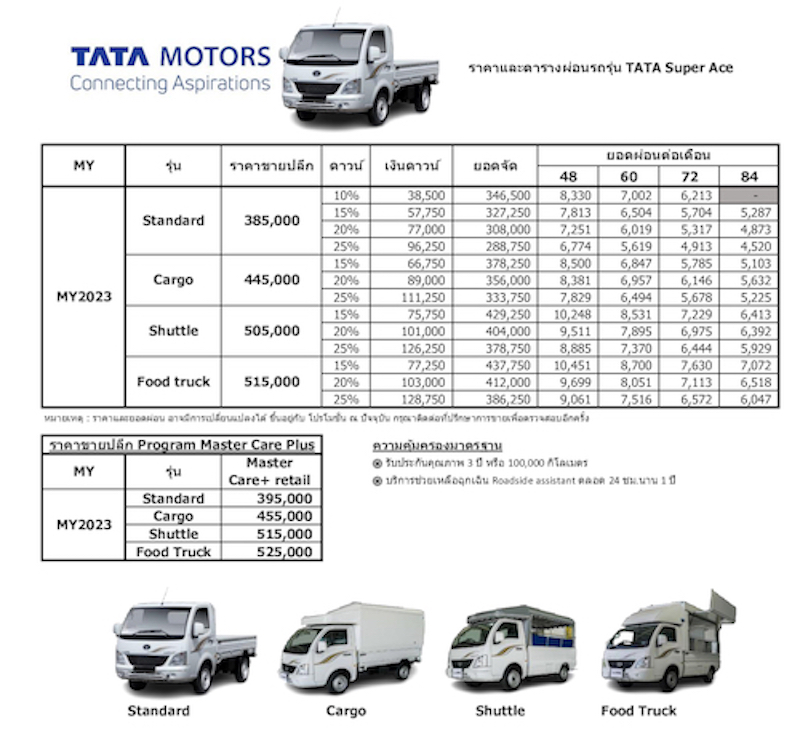 TATA Super Ace ที่มีรูปแบบตัวถังผ่านการตกแต่งมาแล้ว ซึ่งมีให้เลือกถึง 4 แบบ ไม่ว่าจะเป็น Standard, Food Truck, Shuttle และ Cargo ลูกค้าที่ซื้อรถกับเราจึงสามารถเริ่มต้นทำธุรกิจได้ทันที”