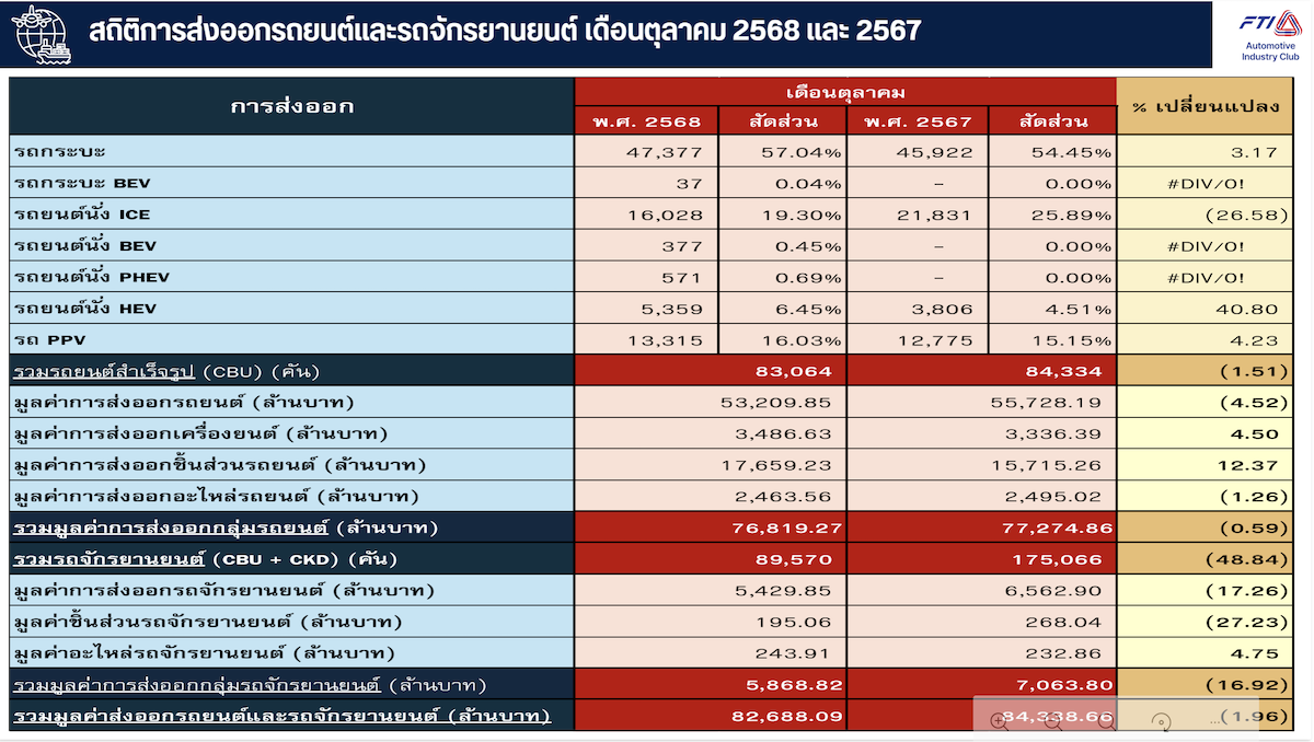 เดือนตุลาคม 2568 ส่งออกได้ 83,064 คัน ลดลงจากเดือนที่แล้วร้อยละ 3.48 และลดลงจากเดือนตุลาคม 2567 ร้อยละ1.51