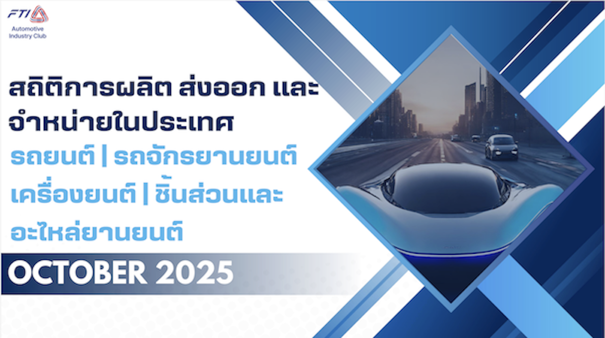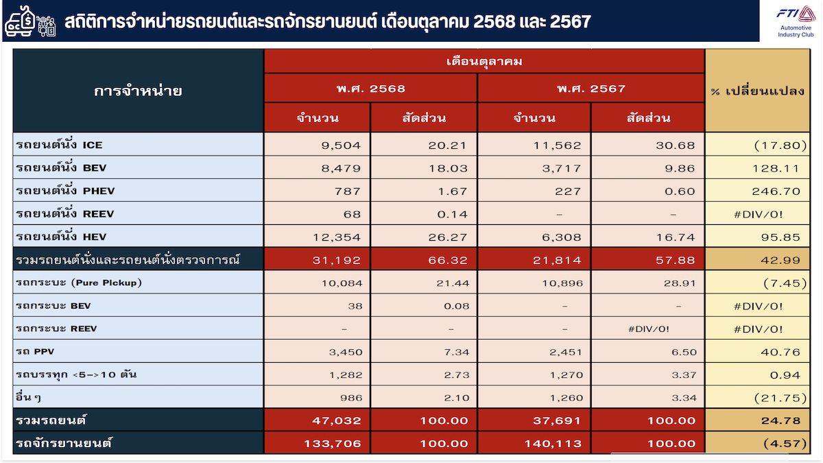 ยอดขายรถยนต์ภายในประเทศของเดือนตุลาคม 2568 มีจำนวนทั้งสิ้น 47,032 คัน ลดลงจากเดือนกันยายน 2568 ร้อยละ 2.73 และเพิ่มขึ้นจากเดือนตุลาคม 2567 ร้อยละ 24.78