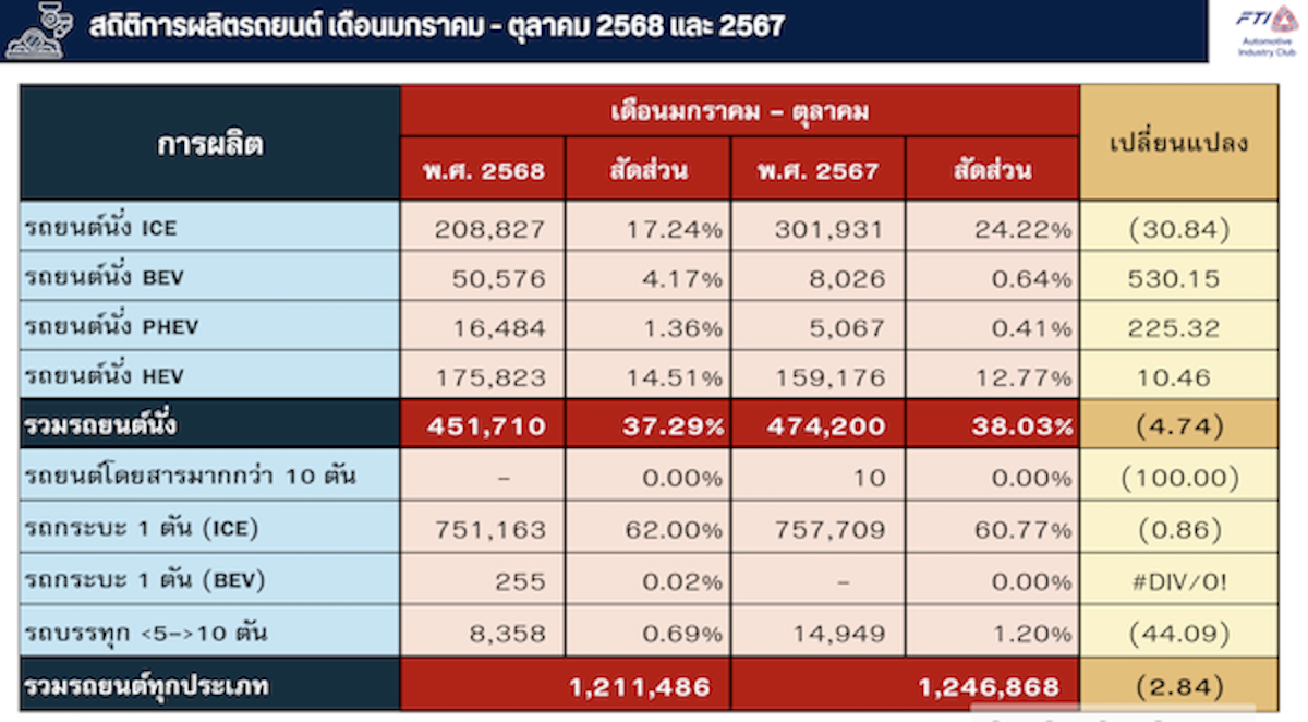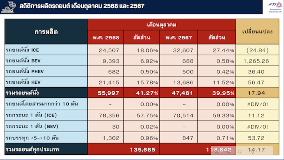 เดือนตุลาคม 2568 ผลิตได้ 53,082 คัน เท่ากับร้อยละ 39.12 ของยอดการผลิตทั้งหมด เพิ่มขึ้นจากเดือนตุลาคม 2567 ร้อยละ 70.68 และเดือนมกราคม – ตุลาคม 2568 ผลิตได้ 420,189 คัน เท่ากับร้อยละ 34.69 ของยอดการผลิตทั้งหมด เพิ่มขึ้นจากเดือนมกราคม – ตุลาคม 2567 ร้อยละ 9.16