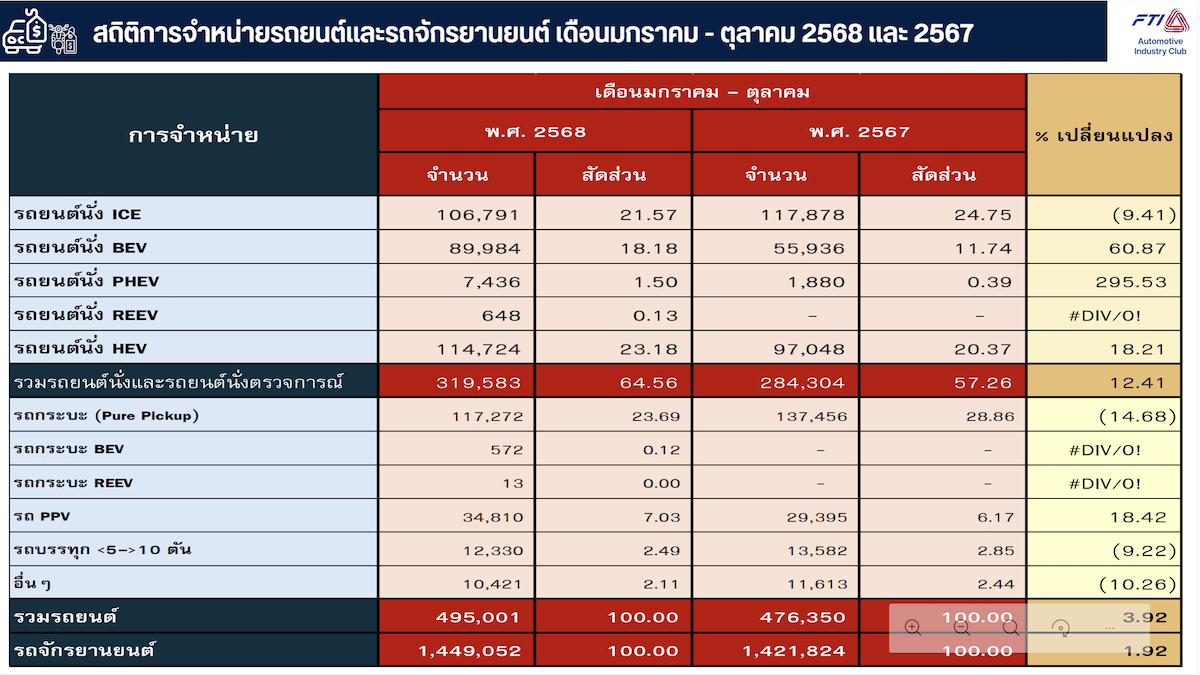ส่วนรถจักรยานยนต์ มียอดขาย 133,706 คัน ลดลงจากเดือนกันยายน 2567 ร้อยละ 0.55 และลดลงจากเดือนตุลาคม 2567 ร้อยละ 4.57 ตั้งแต่เดือนมกราคม – ตุลาคม 2568 รถยนต์มียอดขาย 495,001 คัน เพิ่มขึ้นจากปี 2567 ร้อยละ 3.92 แยกเป็น