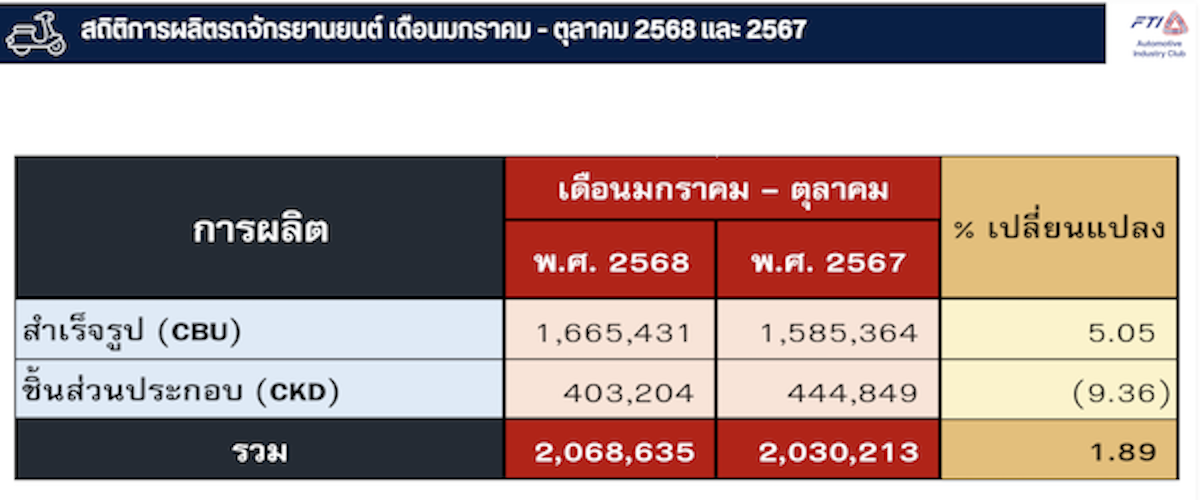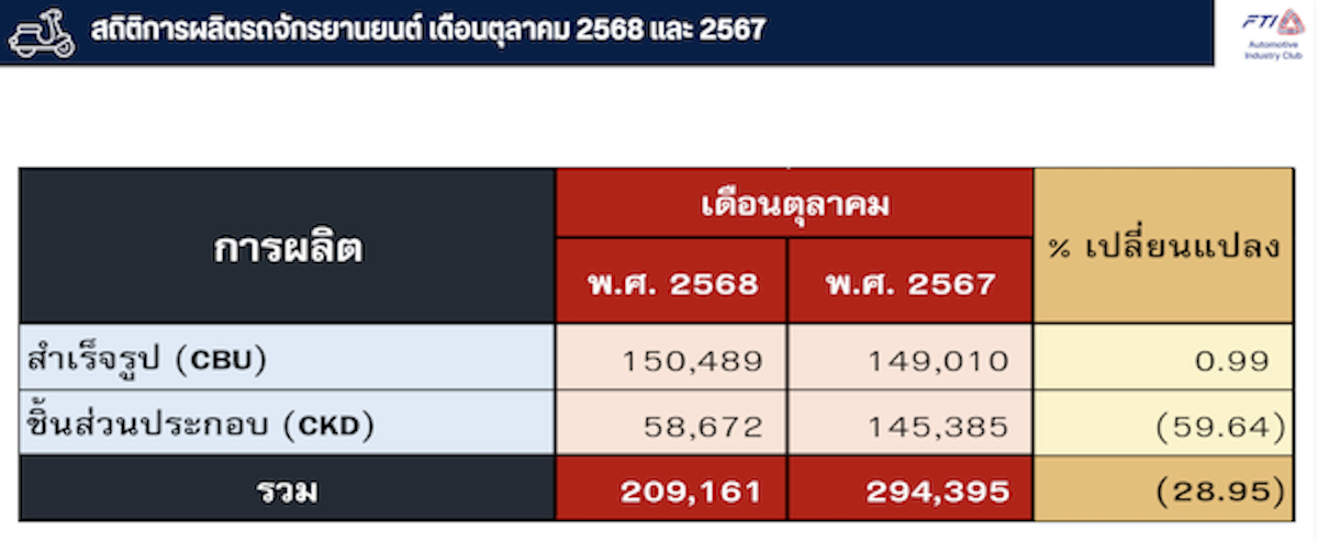 เดือนตุลาคม 2568 ผลิตรถจักรยานยนต์ได้ทั้งสิ้น 209,161 คัน ลดลงจากเดือนตุลาคม 2567 ร้อยละ 28.95 แยกเป็นรถจักรยานยนต์สำเร็จรูป (CBU) 150,489 คัน เพิ่มขึ้นจากปี 2567 ร้อยละ 0.99 และชิ้นส่วนประกอบรถจักรยานยนต์ (CKD) 58,672 คัน ลดลงจากปี 2567 ร้อยละ 59.64