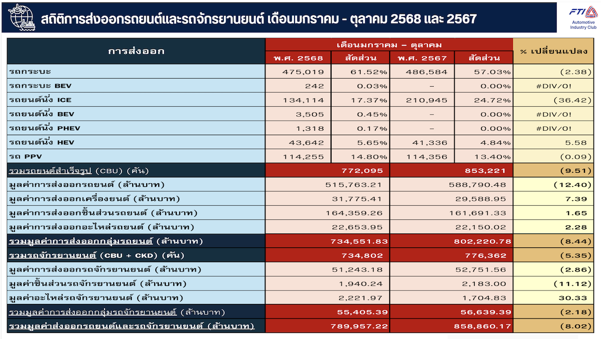 เดือนมกราคม – ตุลาคม 2568 รวมมูลค่าการส่งออกรถยนต์สำเร็จรูป เครื่องยนต์ ชิ้นส่วนอื่นๆ อะไหล่รถยนต์ รถจักรยานยนต์ ชิ้นส่วน และอะไหล่รถจักรยานยนต์ มีทั้งสิ้น 789,957.22 ล้านบาท ลดลงจากปี 2567 ร้อยละ 8.02