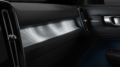 ภายในห้องโดยสารของ The All New Volvo C40 Recharge Pure Electric ถูกออกแบบให้มีความเรียบหรู ทันสมัย แต่บ่งบอกความเป็นตัวตนของผู้ขับขี่ แผงคอนโซลหน้าในสไตล์ Topography Translucent Decor ที่ได้แรงบันดาลใจมาจากภูมิทัศน์ของเทือกเขาในประเทศสวีเดน ใส่ลูกเล่นซ้อนวัสดุที่แตกต่างกันถึง 3 เลเยอร์ ให้มุมมองสามมิติบนผิวสัมผัสที่เรืองแสง
