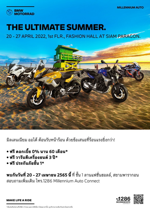 บริษัท มิลเลนเนียม ออโต้ กรุ๊ป จำกัด ผู้จำหน่ายรถยนต์ บีเอ็มดับเบิลยู, มินิ และมอเตอร์ไซค์ บีเอ็มดับเบิลยู มอเตอร์ราด อย่างเป็นทางการ จัดหนักรับซัมเมอร์ ด้วยข้อเสนอสุดร้อนแรงที่งาน ‘THE ULTIMATE SUMMER BY MILLENNIUM AUTO’ ยกทัพยนตรกรรมระดับพรีเมียม มาให้ลูกค้าได้สัมผัสและจับจอง ระหว่างวันที่ 20-27 เมษายนนี้ บริเวณแฟชั่นฮอลล์ ชั้น 1 ศูนย์การค้าสยามพารากอน