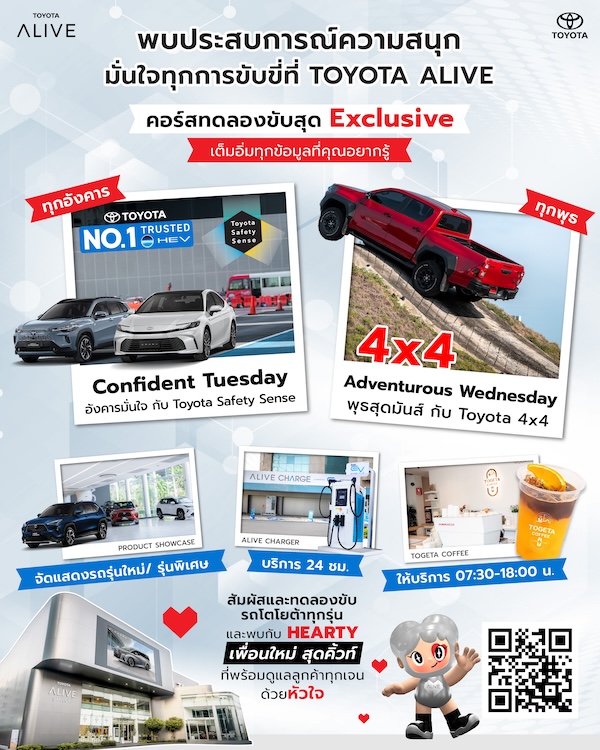 ขับเคลื่อนความสุขครั้งใหม่ กับ TOYOTA ALIVE พบกิจกรรมใหม่ ทั้งคอร์สทดลองขับรถพิเศษ และมาสคอตสุดน่ารัก “น้อง HEARTY” คอร์สทดลองขับรถโตโยต้าพิเศษ กับกิจกรรม “Confident Tuesday อังคารมั่นใจกับ Toyota Safety Sense” และ “Adventurous Wednesday พุธสุดมันส์ กับโตโยต้า 4×4”