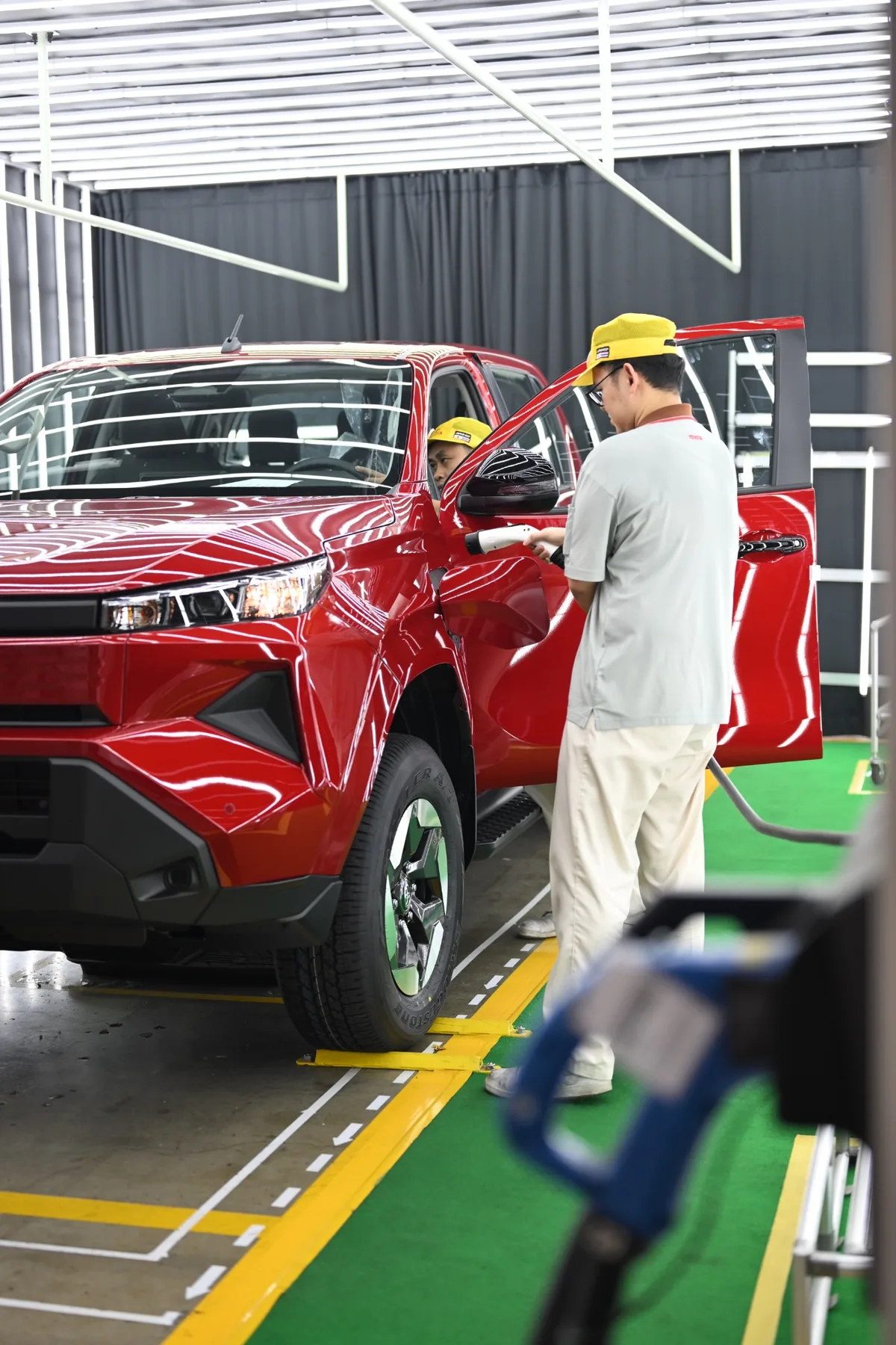 อีกหนึ่งไฮไลต์ของกิจกรรมครั้งนี้คือสายการผลิตรถกระบะไฟฟ้า Hilux Travo-e ซึ่งเริ่มดำเนินการอย่างเป็นทางการตั้งแต่เดือนธันวาคม 2568 โดยโตโยต้าออกแบบไลน์ผลิตนี้ให้มีความยืดหยุ่นสูง รองรับการเปลี่ยนแปลงของเทคโนโลยีและปริมาณการผลิตในอนาคต ต่างจากสายการผลิตรถเครื่องยนต์สันดาปแบบเดิมที่มีจำนวนสถานีและขั้นตอนมากกว่าอย่างชัดเจน