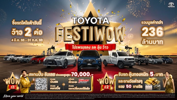 โตโยต้าเสิร์ฟโปรโมชันเด็ดช่วงกลางปี “โตโยต้า เฟสติว้าว (FESTIWOW) โปรพรมแดง ลด ลุ้น ว้าวว” กับข้อเสนอพิเศษที่จะทำให้ว้าว 2 ต่อ กับ