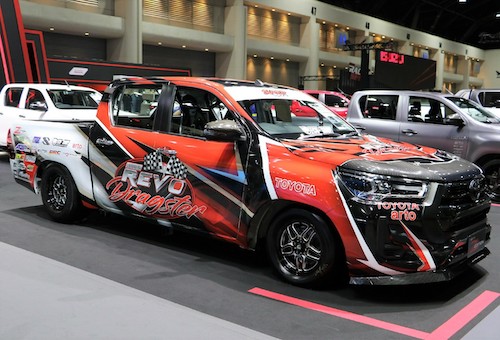 -“REVO Dragster” ถูกตกแต่งมาจาก Toyota Hilux REVO Double Cab Z Edition 2.4 Entry ภายใต้แนวคิดของการโมดิฟายให้เห็นว่าเครื่องยนต์สามารถทำแรงม้าในระดับ 500 แรงม้า ได้อย่างไม่ยากเย็น มาพร้อมทั้งเครื่องยนต์ 2GD FTV, โมดิฟายฝาสูบ ก้านสูบ ลูกสูบ ข้อเหวี่ยง ATP, กล่อง ECU=Shop Junior Touch + Cube Touch, เทอร์โบ ATP, อินเตอร์คูลเลอร์ BRD,