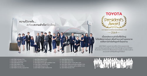 “Toyota President’s Award” คือรางวัลแห่งความสำเร็จ จากผลการดำเนินงานตลอดปีที่ผ่านมาของผู้แทนจำหน่าย โดยประเมินครบทั้ง 3 ด้าน ได้แก่