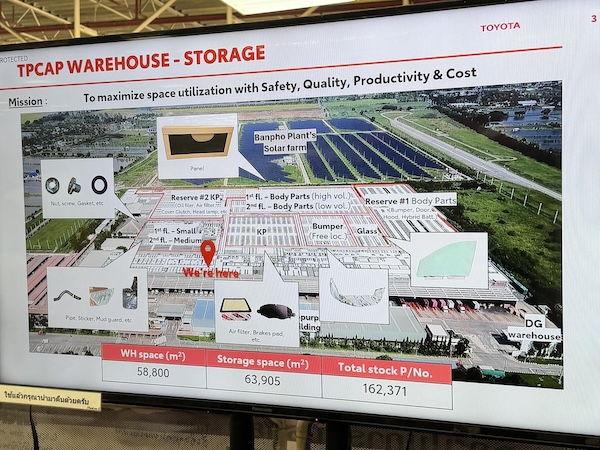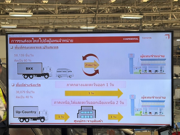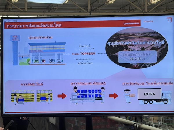 ศูนย์อะไหล่โตโยต้าดำเนินงานภายใต้ระบบจัดการชิ้นส่วนที่เป็นระเบียบแบบแผน โดยอ้างอิงกระบวนการภายใต้มาตรฐานของเครือข่ายศูนย์อะไหล่โตโยต้าทั่วโลก ซึ่งช่วยให้สามารถจัดส่งอะไหล่กว่า 120,000 ชิ้นต่อวันไปยังศูนย์บริการโตโยต้าทั่วประเทศ