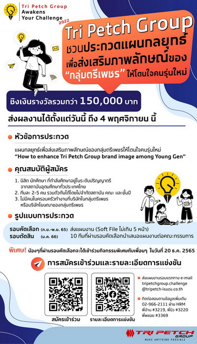 กลุ่มตรีเพชร โดย บริษัท ตรีเพชรอีซูซุเซลส์ จัดประกวดโครงการ “Tri Petch Group Awakens Your Challenge 2022” เพื่อค้นหานักวางแผนกลยุทธ์มากความสามารถ ในหัวข้อ “การประกวดแผนกลยุทธ์เพื่อส่งเสริมภาพลักษณ์ของ “กลุ่มตรีเพชร” ให้โดนใจคนรุ่นใหม่”