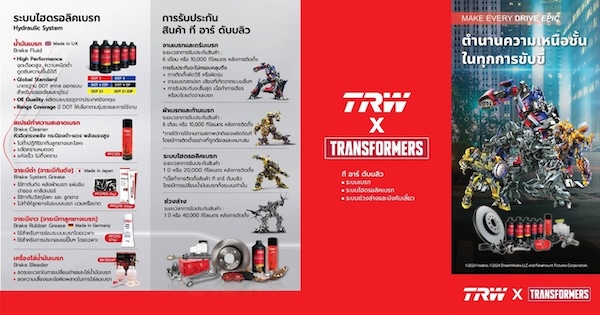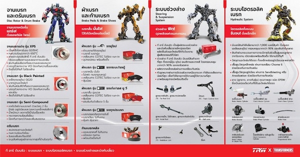 เฉกเช่นเดียวกับคาแรกเตอร์ Transformers เพื่อให้ผู้บริโภคเกิดการจดจำแบรนด์ TRW x Transformers ซึ่งจะเป็นการสร้างโอกาสทางการตลาดให้มากขึ้น โดยรายละเอียดของผลิตภัณฑ์ทั้ง 4 กลุ่มที่เชื่อมยงกับคาแรคเตอร์หลัก ได้แก่
