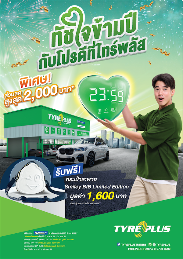 ไทร์พลัส ศูนย์บริการรถยนต์ครบวงจร จัดแคมเปญพิเศษส่งท้ายปีเก่า ต้อนรับปีใหม่ ให้ลูกค้าคนพิเศษ กับโปรโมชั่นหลากหลายให้ผู้ขับขี่ได้เลือกใช้ตามความต้องการครบทุกรูปแบบ เพียงซื้อยางมิชลินหรือบีเอฟกู๊ดริชรุ่นใดก็ได้ จำนวน 4 เส้น รับส่วนลดหรือของขวัญทันที มูลค่าสูงสุด 2,000 บาท ตั้งแต่วันนี้เป็นต้นไป ที่ศูนย์บริการไทร์พลัสทั่วประเทศ
