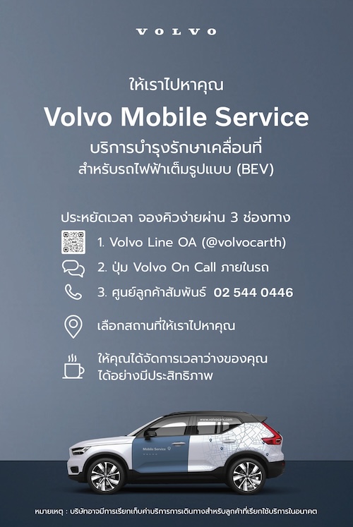 เพื่อยกระดับการให้บริการและตอบโจทย์ไลฟ์สไตล์ยุคใหม่ของผู้ใช้รถไฟฟ้าเต็มรูปแบบ (BEV) ขึ้นอีกขั้น วอลโว่ คาร์ ประเทศไทย เปิดตัวบริการบำรุงรักษาเคลื่อนที่ Volvo Mobile Service ที่พร้อมมอบความสะดวกสบายถึงหน้าประตูบ้านหรือสถานที่ที่ลูกค้านัดหมาย ในการให้บริการบำรุงรักษารถแบบครบวงจรพร้อมอะไหล่แท้จากวอลโว่ มอบประสบการณ์อันสอดคล้องกับไลฟ์สไตล์ที่ยืดหยุ่นแก่ลูกค้าวอลโว่