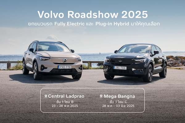 วอลโว่ คาร์ ประเทศไทย จัดกิจกรรม Volvo Roadshow 2025 นำเสนอนวัตกรรมยานยนต์รุ่นใหม่ล่าสุดจากวอลโว่ทั้งในรุ่นรถไฟฟ้าเต็มรูปแบบ และรุ่นปลั๊กอินไฮบริด ให้ผู้สนใจได้ทดลองสัมผัสและเป็นเจ้าของ พร้อมมอบข้อเสนอสุดพิเศษหลากหลายรายการภายในงาน ระหว่างเดือนพฤษภาคม – มิถุนายน พ.ศ. 2568 ณ ศูนย์การค้าเซ็นทรัล ลาดพร้าว และ ศูนย์การค้าเมกาบางนา