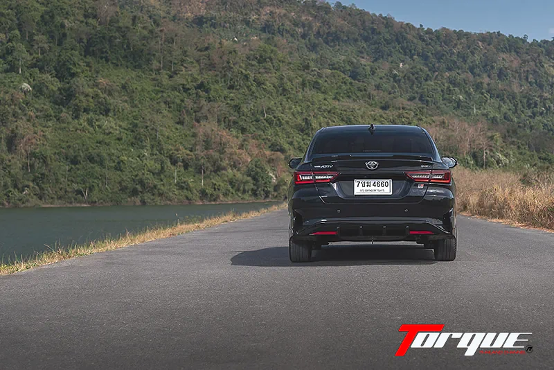 ชุดแต่งรอบคันที่ทำให้ Yaris ATIV HEV GR Sport ต่างจากพี่น้องร่วมอนุกรม ไม่ส่งผลด้านลบต่อการขับขี่ใช้งานในชีวิตประจำวัน เพราะความยาวรวมของรถเพิ่มขึ้นเพียง 15 มม. ขณะที่ระยะต่ำสุดถึงพื้นยังคงเท่ากับ ATIV รุ่นมาตรฐานที่ 160 มม. จึงไม่ต้องกังวลว่าชุดแต่งจะครูดกับพื้นเมื่อขับขึ้นลงทางชัน